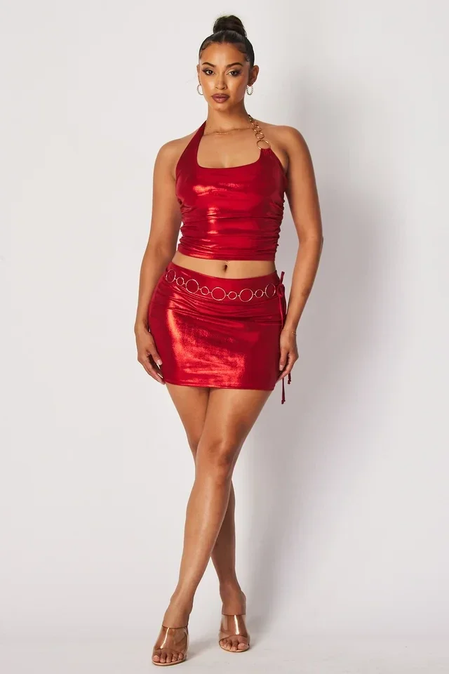 Two-piece skirt set with the silk look with gold loop on the shoulder