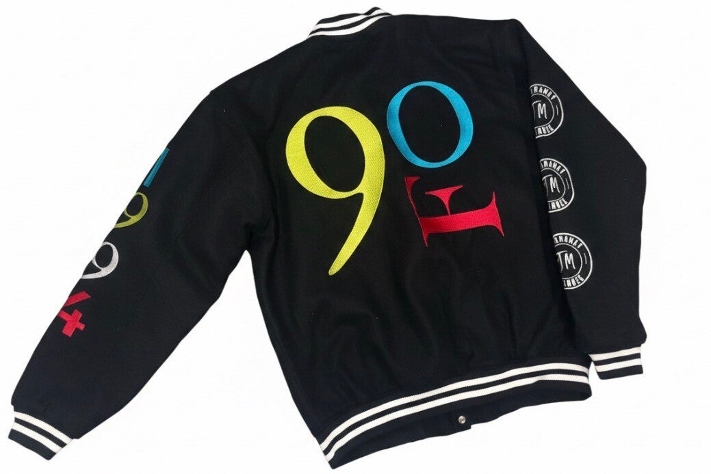 Crafted with a sleek black body and contrast ribbed trim, this jacket features vibrant multi-color embroidered and printed details throughout. The front showcases unique graphic patches and signature numbering, while the back commands attention with oversized “9 FO= 94 typography in striking color accents. Finished with snap-button closure and detailed sleeve artwork, this piece is designed for those who move confidently and unapologetically.